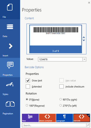 After inserting a Barcode into your Document Template, you may wish to make some adjustments such as changing the Value or perhaps even the Orientation. To do so, you can easily access the Properties associated with your barcode using the Properties Dialog.