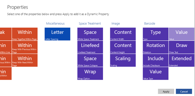 For the usage of Dynamic Properties for a barcode, you will need to follow the instructions in the Dynamic Properties help section to select Value as a Dynamic Property and then find the field in your data to obtain this Value from. Notice in the images below the two steps you will use to specify first the value and then selecting your data source. You can select Apply throughout this process to complete the dynamic value configuration and return to the Barcode Properties.
